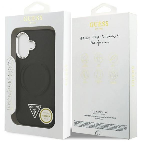 Оригинален калъф / гръб / GUESS Leather Triangle Metal Logo кейс с безжично зареждане MagSafe за Apple iPhone 17 (6.3) - черен