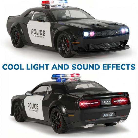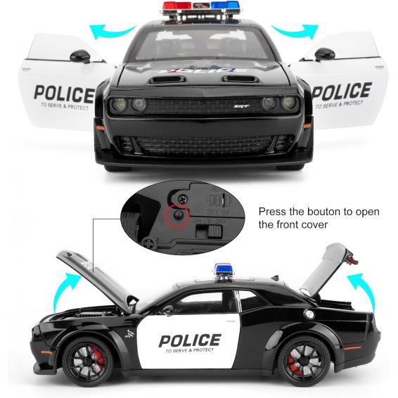 - Насладете се на емблематичната спортна визия на Dodge Challenger Police с този детайлен умален модел в мащаб 1:24.