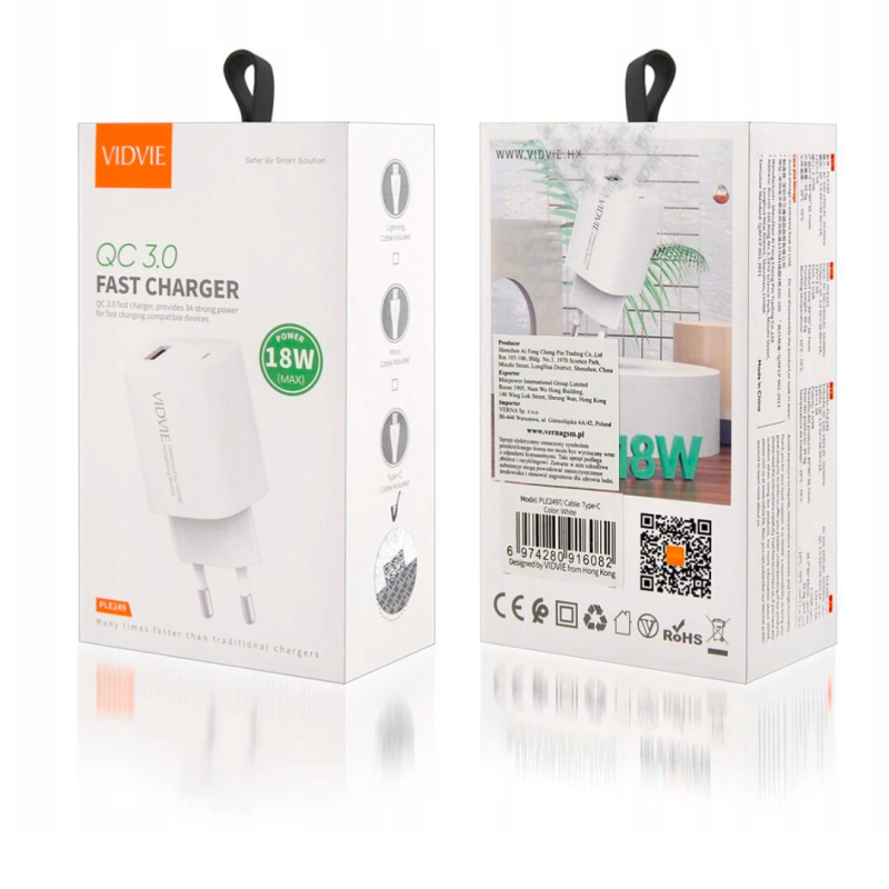 Зарядно устройство VIDVIE PLE249 220V 18W / USB to Lightning - бяло ОПИСАНИЕ Модел: PLE249 Вход: 100-240VAC 50/60HZ Изход: QC3.0, 5V3A 9V2A 12V1.5A USB интерфейс: Работна температура: 70 ℃