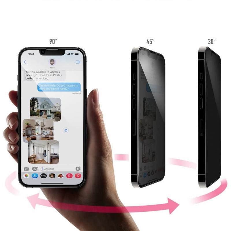 PRIVACY (дискретен) стъклен протектор за Apple iPhone 13 Pro и 13. Защитава не само вашия смартфон, чрез доказаното качество, но и най-важния ви актив: вашата лична информация от ЛЮБОПИТНИ очи. Протектора прогресивно замъглява и потъмнява екрана на устройствата, когато те се наблюдават под ъгъл. FULL GLUE - с лепило по цялата повърхност и CASE FRIENDLY - размер съвместим с почти всички видиве калъфи.