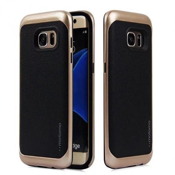 Луксозен твърд гръб MOTOMO Hybrid със силиконов кант за Samsung Galaxy J3 / J3 2016 J320 - черен със златист кант / имитиращ кожа