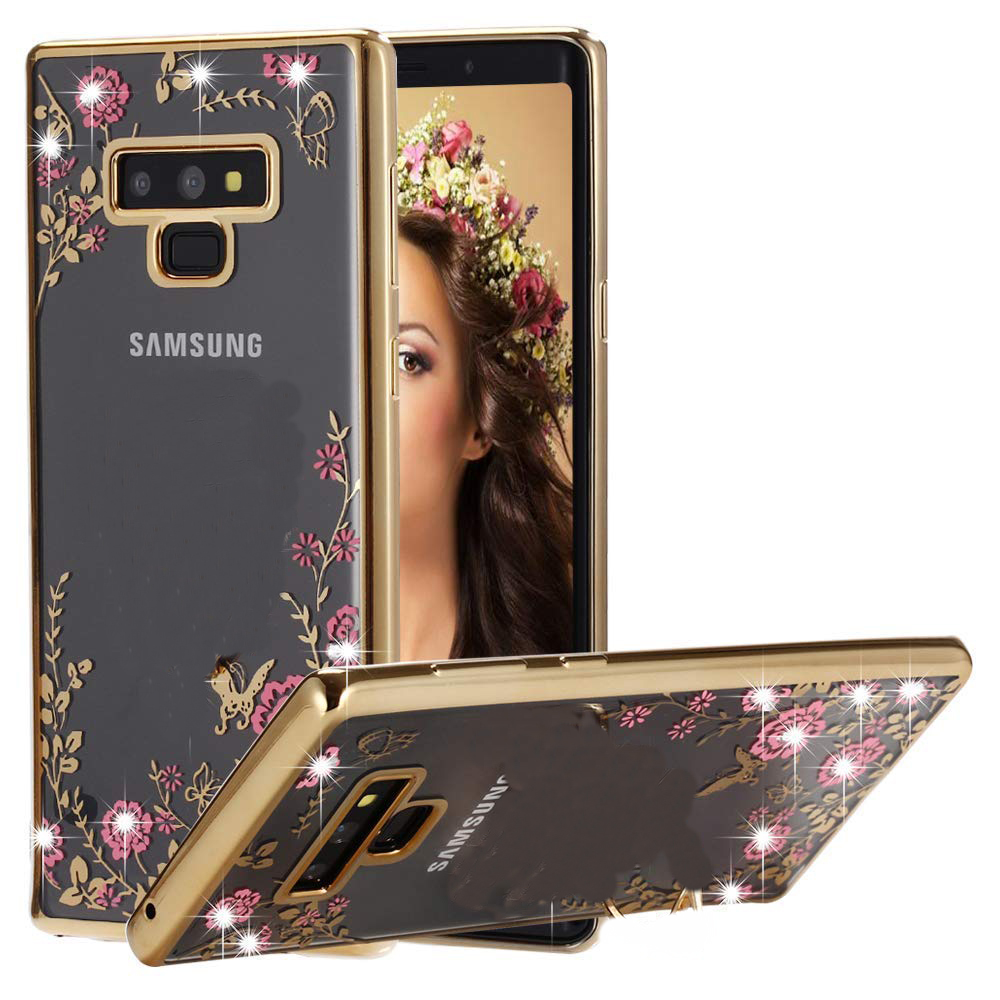 Луксозен силиконов калъф / гръб / TPU с камъни за Samsung Galaxy Note 9 - прозрачен / розови цветя / златен кант